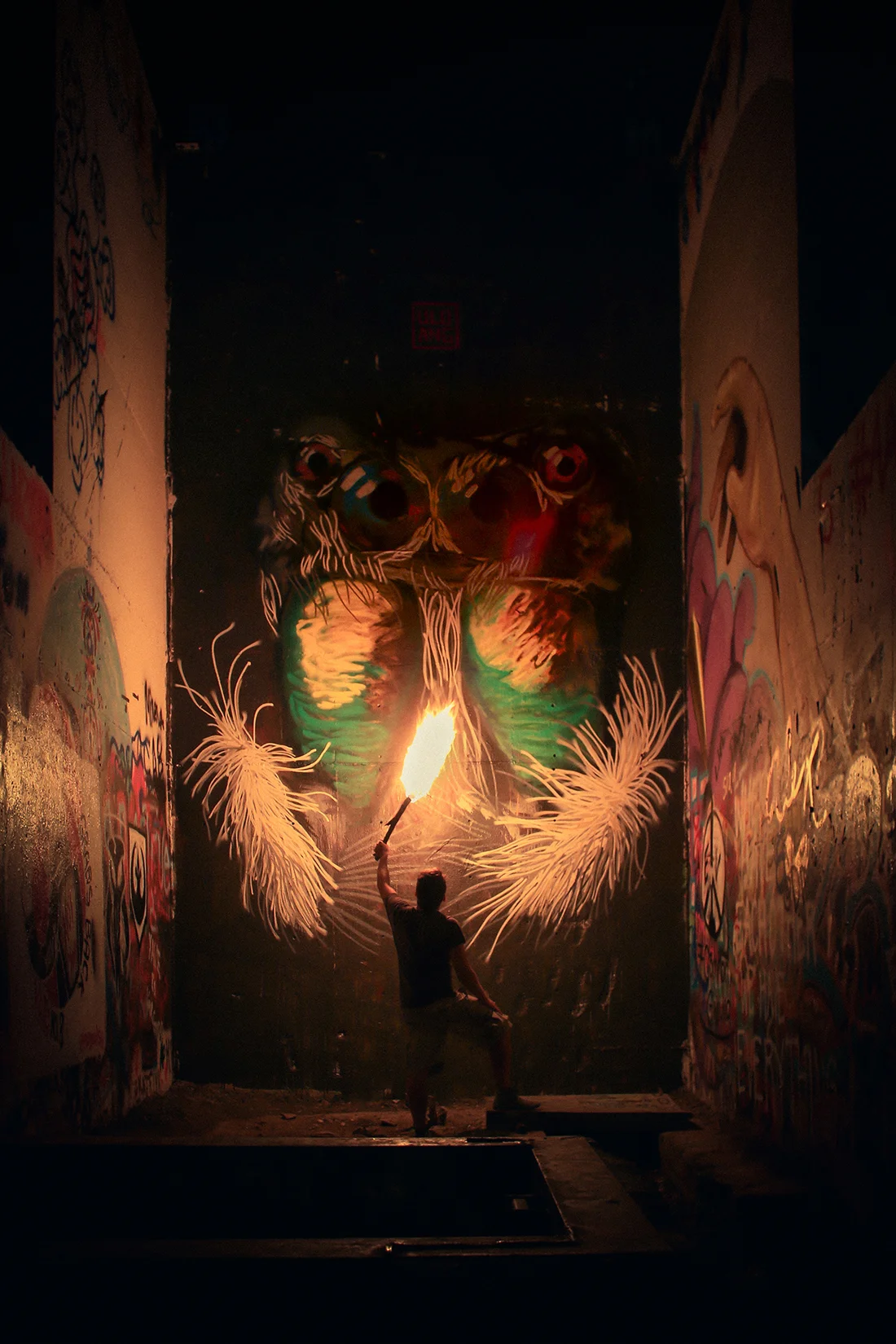 Street artist Scott Addis using his own material concoction to sculpt faces on palm trees in Wynwood.